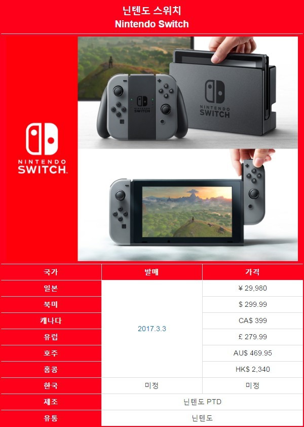 닌텐도 스위치 가격 및 스펙 한국 발매 가능성은