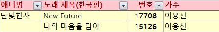달빛천사 Tj미디어 한국판 일본판 노래방 번호 정리