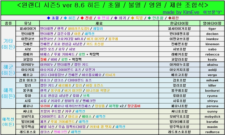 원랜디 8 5 히든조합 조합표 다운