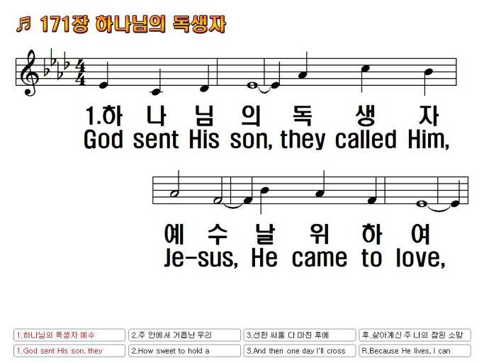 참 기쁨과 확신 가지고 예수님의. 주 앞에서 거듭난 생명 도우시는 주의 사랑. 한영악보 23 because he lives 주하나님 독생자 예수 살아계신주 pdf 유튜브 주소. 주 하나님 독생자 예수 날 위하여 오시었네 내 모든 죄 다 사하시고 죽음에서 부활하신 나의 구세주 2.