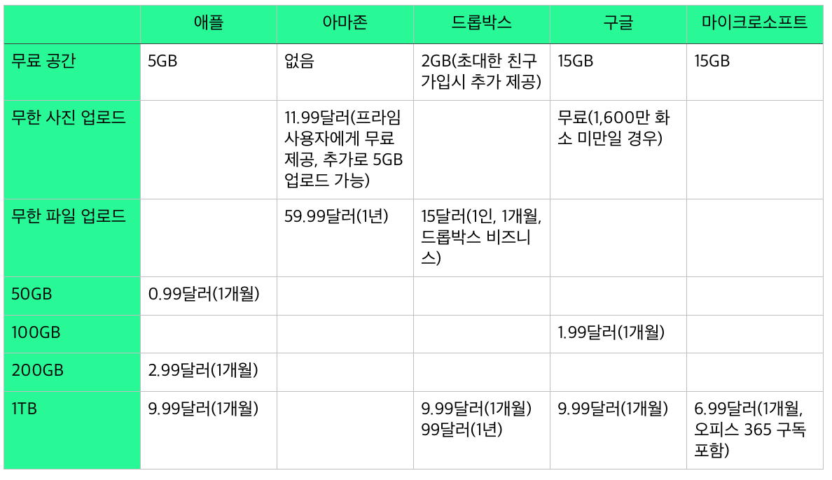 무료 클라우드 Cloud 서비스 비교 구글 애플 Ms 아마존 드롭박스