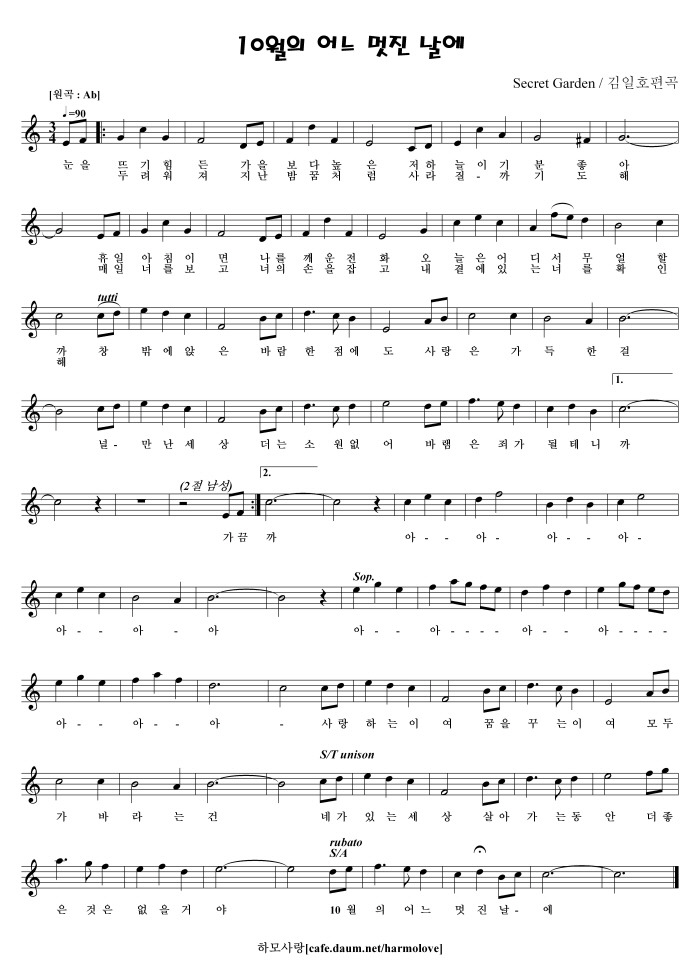 10월의 어느 멋진 날에 가사 및 악보 여 눈을 뜨기 힘든 가을 보다 높은 저 하늘이 기분 좋아 휴일 아침이면 나를 깨운 전화 오늘은 어디서 무얼 할까 창밖에 앉은 바람 한 점에도 사랑은 가. 악보 serenade to spring 10월의 어느 멋진날 본문. 이 곡은 노르웨이의 뉴에이지 그룹 시크릿가든 연주한 serenade to spring 곡이라고 합니다. 10월의 어느 멋진 날에 악보 다운 김동규 10월에 어느 멋진날에 악보 var articleno 17949810.